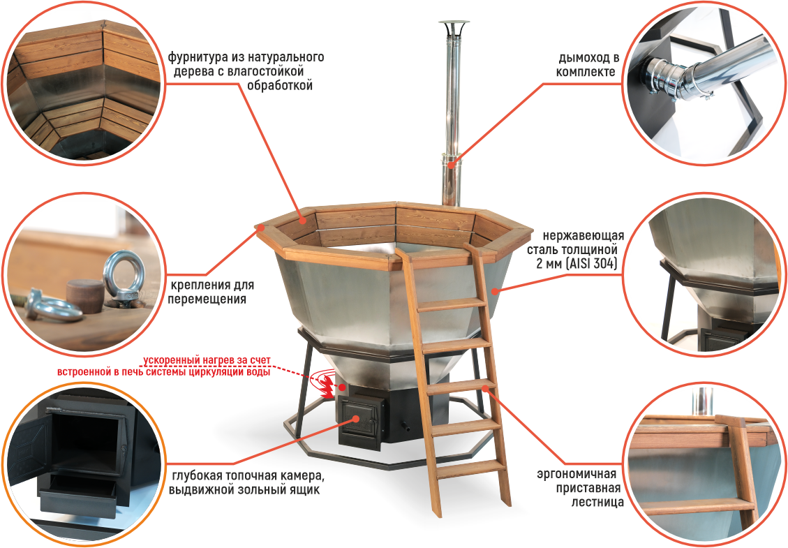 Мгновенное тепло и неповторимая атмосфера: благодаря высокой теплопроводности стали, а также печи, оснащенной системой циркуляции воды в самом чане, он быстро наполняется мягким, равномерным теплом. А живой огонь и треск настоящих дров создают особую ауру уюта и спокойствия — ощущение гармонии с природой. Топка дровами позволяет управлять температурой вручную, создавая идеальные условия для расслабления.